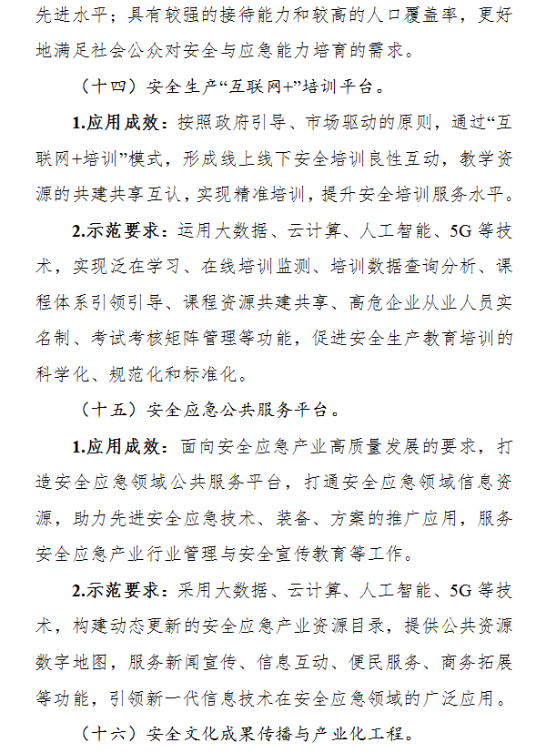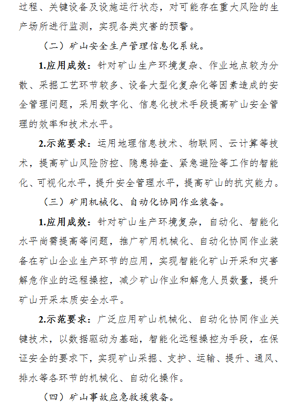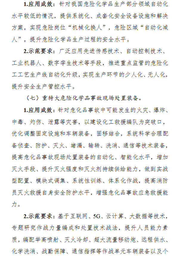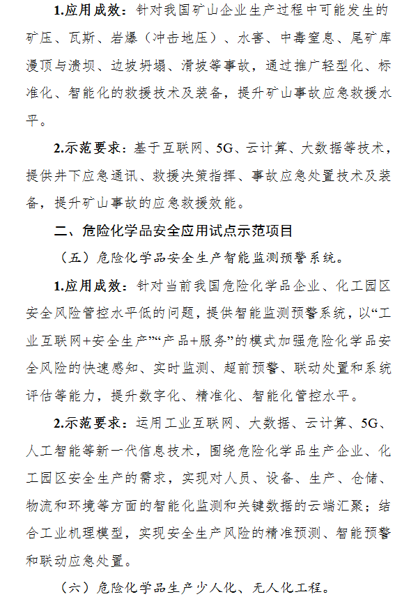 圍繞礦山安全、危化品安全、自然災害防治、安全應急教育服務四方面需求,從安全生產監測預警系統、機械化與自動化協同作業裝備、事故現場處置裝備等16個重點方向(詳見附件),遴選一批技術先進、應用成效顯著的試點示范項目。