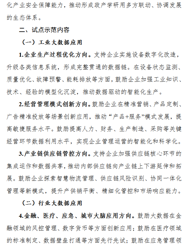 本次申報(bào)圍繞工業(yè)大數(shù)據(jù)應(yīng)用、行業(yè)大數(shù)據(jù)應(yīng)用、大數(shù)據(jù)重點(diǎn)產(chǎn)品、數(shù)據(jù)管理及服務(wù)四個(gè)方向,征集并遴選一批大數(shù)據(jù)產(chǎn)業(yè)試點(diǎn)示范項(xiàng)目,通過(guò)試點(diǎn)先行、示范引領(lǐng),總結(jié)推廣可復(fù)制的經(jīng)驗(yàn)做法,推進(jìn)大數(shù)據(jù)產(chǎn)業(yè)高質(zhì)量發(fā)展。申報(bào)指南詳見(jiàn)附件。